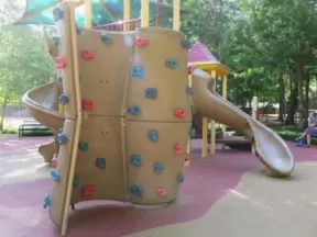 Running trails under incredible tall trees, large playground, and tennis, racquetball, volleyball and basketball courts.