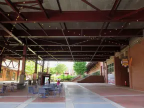 A small, attractive shopping center with cafes, boutiques, a coffee shop, a farmers market, and nice lights at night.