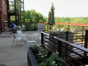 Unique redevelopment complex with man-made river, bee hive behind glass, colorful decorations, live music, and a few restaurants.