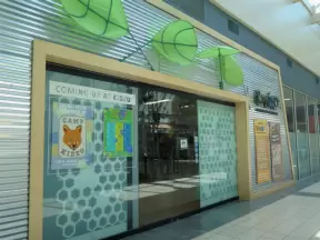 An attractive indoor mall with carousel, candy store, toy store, tropical food court, and play area for kids.