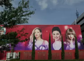 A trendy street in the middle of a sketchy neighborhood, with cafes and colorful graffiti-covered walls.
