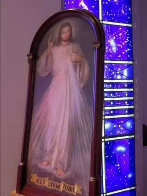 Beautiful, modern cathedral with colorful statues, the twelve stations of the cross, bright stained glass, light-filled rotunda, and amazing organ.