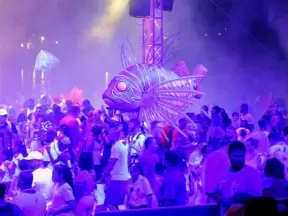 Awesome huge venue with wonderful breeze blowing through balcony, wood floors, guitars on high ceiling, and pink wave wall.
