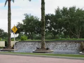 Town with splash pad on the lake, town square with cafes, playground, and lots of stores.