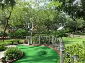 Mini-golf park with lush, colorful grounds, plus arcade games, mini-carousel, and rides.