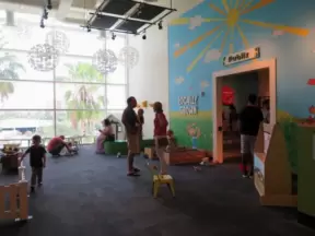 Super children's museum with rope climbey, music station, dance area, lincoln logs, magnetic triangles, sand that responds, supermarket, and more!