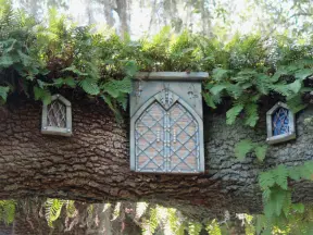 Whimsical sculptures of fairy tale scenes in the middle of a giant oak forest with Spanish moss and vines. Magic!