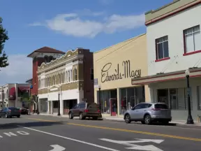 Historic main strip that looks dowdy from a distance but is actually very nice up close! Incredible waterfront stage and boardwalk!