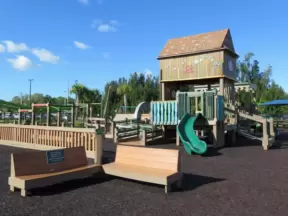 Super fun ocean-themed wooden playground with ship, shark to climb, stepping stones, tire swing, see saw, mist, and mosaic mermaid castle.