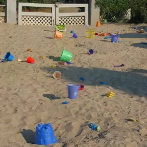 Peaceful spot with nice sand (great for building), blue water (from a distance), the sound of water lapping the shore, green lawn, playground, and trees for shade.