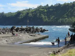 A tiny black sand beach, emerald green springs, grassy knolls, a lifeguard, and warm-water swimming or body boarding.