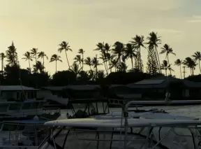 Pier with crystal clear water and views of the church steeple and high mountains backing the bay. Calm cove with Hawaiian hei'au out in the water.