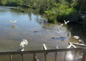 Incredible wetlands with huge gators, birds, and flowers. Emus, deer, playful bobcats, panthers, and three shows. Plus petting zoo with goats, and feeding budgerigars with seedsticks.