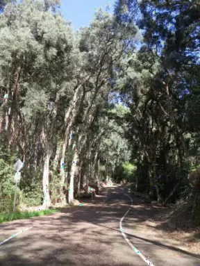 Lovely path beside a eucalyptus forest, on both sides of the creek, with workout stations, in a residential neighborhood. You can walk two miles total. Also called San Luis Ranch.