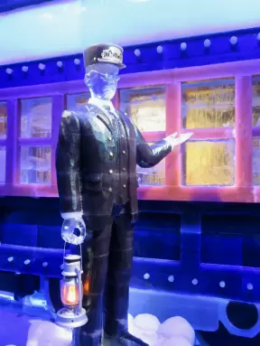 Hotel inside a giant atrium with tropical plants, fish, alligators, and decorations. ICE sculpture event in December.
