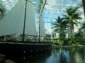 Hotel inside a giant atrium with tropical plants, fish, alligators, and decorations. ICE sculpture event in December.