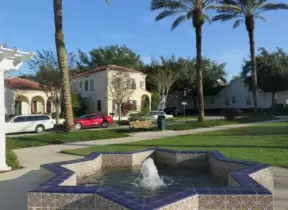 Restaurants with magical gardens, shops, fountain, open grassy areas, historical salmon-pink Spanish Revival architecture at a former naval training center.