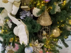 Hotel inside a giant atrium with tropical plants, fish, alligators, and decorations. ICE sculpture event in December.