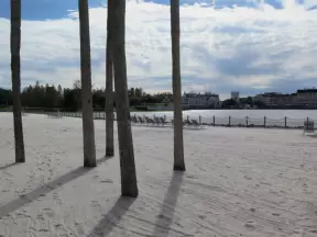 Large lagoon with clear water where kids can swim, tons of shade, and playground in the sand.