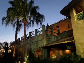 A Spanish paseo and courtyard with archways, little lights, flags, murals, lifelike statues, and fountains. At night, a magical spot!