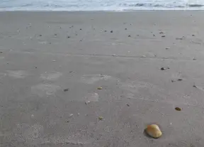 Wide-open beach with pale grey sand, shells on the shore, and aquamarine water, across from a playground, turtle center, and hike.