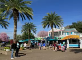 Waterfront area with restaurants, live street performers, entertainment, toy stores, and carousel.