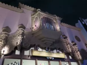 A Spanish paseo and courtyard with archways, little lights, flags, murals, lifelike statues, and fountains. At night, a magical spot!