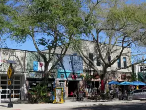 Main strip of West Palm Beach, with colorful and inviting architecture and decorations.