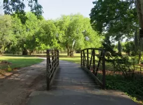 Lively park with long winding walking paths, tennis courts, sports fields, playgrounds, archery range, and aquatic center.