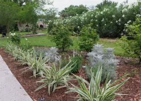 Lovely path beside a eucalyptus forest, on both sides of the creek, with workout stations, in a residential neighborhood. You can walk two miles total. Also called San Luis Ranch.
