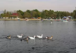 A huge wonderful park with a new playground that is out of this world, a lake with paddle boats, and plenty of trees and grass.