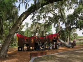 Amazing wooden playground with splash pad and gizmos galore, plus carousel and free science museum, all in a tropical setting.