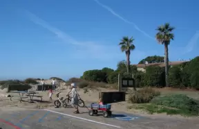 Large windy beach with fun dunes to play on, a bike path, and a grassy picnic area in a valley set back from the beach.