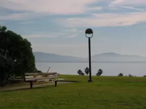 Small park with picnic tables, and views across the water to Reeds Bay Beach Park.