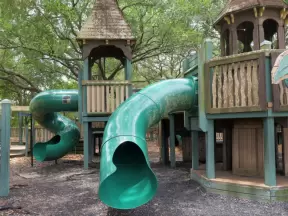 Best playground you'll ever visit! Huge slides, hillside slides, steep grass slope for cardboard sledding, cable zipline, and pretty trees to picnic under.