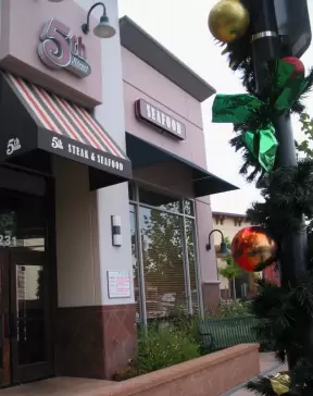 Spiffy outdoor mall with cute inner courtyard with strung lights, palms, and fountain.