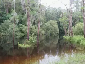 Shady white sand walking trails, and a dock on the Crooked River, with cute cypress trees and wildflowers along the path.