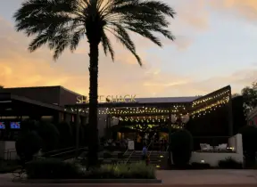 Spiffy outdoor mall with cute inner courtyard with strung lights, palms, and fountain.