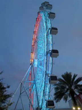 Wide walking path along the water with tropical flowers, piers, grand high rises, and palm trees- no shade though.