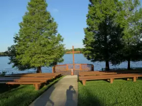 A popular town center with sidewalk cafes leading down to a pretty lake with a walking path.