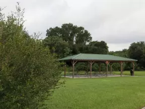 Tropical park with sky-high playground for older kids, toddler playground, fitness trail and stations, pale-lime gazebo, and spiffy basketball courts.