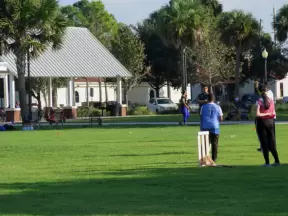 Sports fields and walking trail beside a banyan tree grove, in a city area.