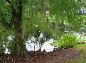 Tropical paradise with amazing trees, soft green grass, and woven huts shading picnic tables with BBQs that line the river, plus bike and kayak rentals. Beware alligators.