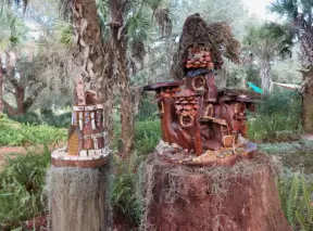 Whimsical sculptures of fairy tale scenes in the middle of a giant oak forest with Spanish moss and vines. Magic!