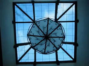 Stunning Spanish Renaissance style church with peaceful blue interior and Tiffany glass windows.