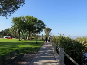 Pretty beach with 1km walking path on the cliffs and gigantic sloped lawn.