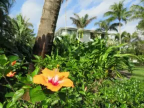 Beautiful garden with many partitioned areas, tropical plants, flowers, all with the blue lake behind. Plus, promenade around the lake.