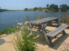 Bluff-top trail full of flowers in the spring. Lovely rugged beach and lagoon below.