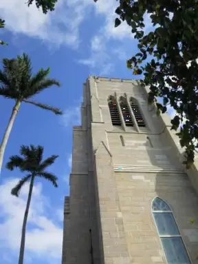 Delightful garden behind a gothic church, with lily pond, koi fish, tropical flowers, sculpted coral walls, fountain, and fresco.