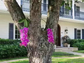 A tropical wonderland of palms, ferns, bromeliads, fountains, sculptures, rocks, ironwork gates, and pergolas, with the delightful scent of flowers filling the air.